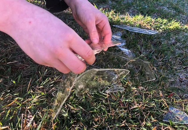This week I watched a couple of nine and ten year old children responding with delight and surprise to the layers of ice that had appeared on the puddles in their playground overnight. I observed as they spend a very long period of time investigating and discussing how best to remove the sheets of ice from the puddle without breaking them. With many different theories afoot, they embarked on a negotiated process to move the ice sheets onto the grass and footpath in order to use them as a lens for research; to compare the textures of different ground surfaces viewed through the magnification and reflection of ice.
